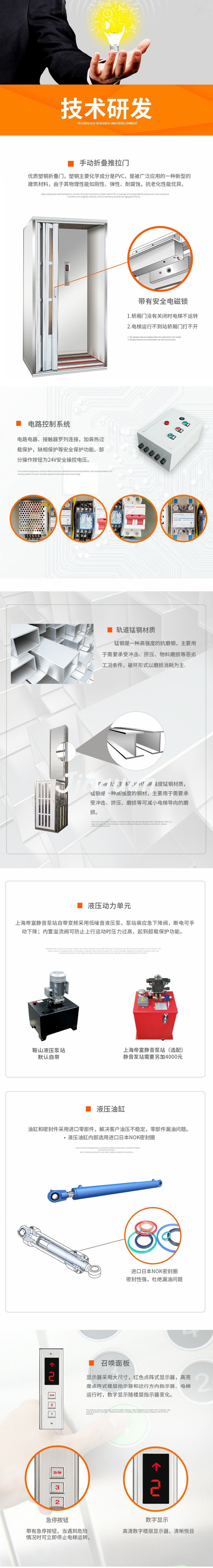 家用電梯采用液壓傳動,所以運行非常平穩。其液壓系統攜帶防爆閥,故障時可控制下降速度;另外,采用高強度鏈條牽引電梯上下,另附加鋼絲繩防止墜落,從而保證電梯的安全運行。