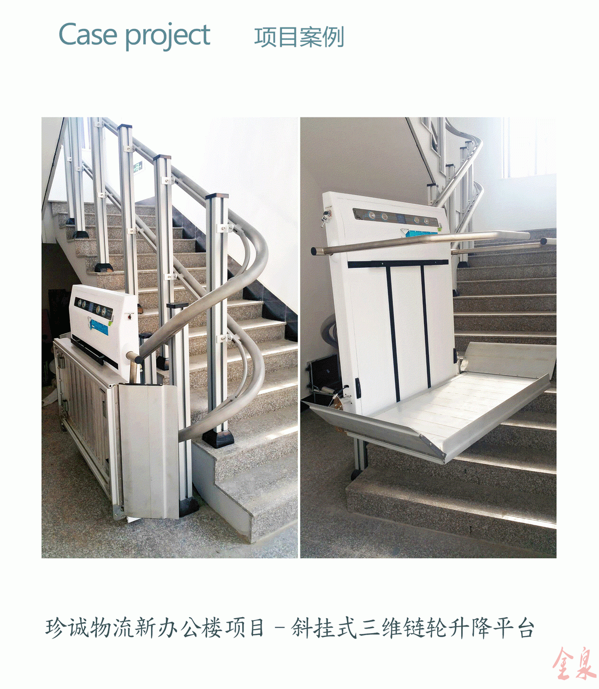 傾斜式無障礙升降平臺可安裝在室內和室外,可安裝在大型公共場所,如療養院,學校,餐廳,酒店,機場,地鐵,商場等。我們的斜掛式無障礙升降機平臺使用根據樓梯形狀設計的高精度導軌,可應用于直線,弧形,螺旋形樓梯。